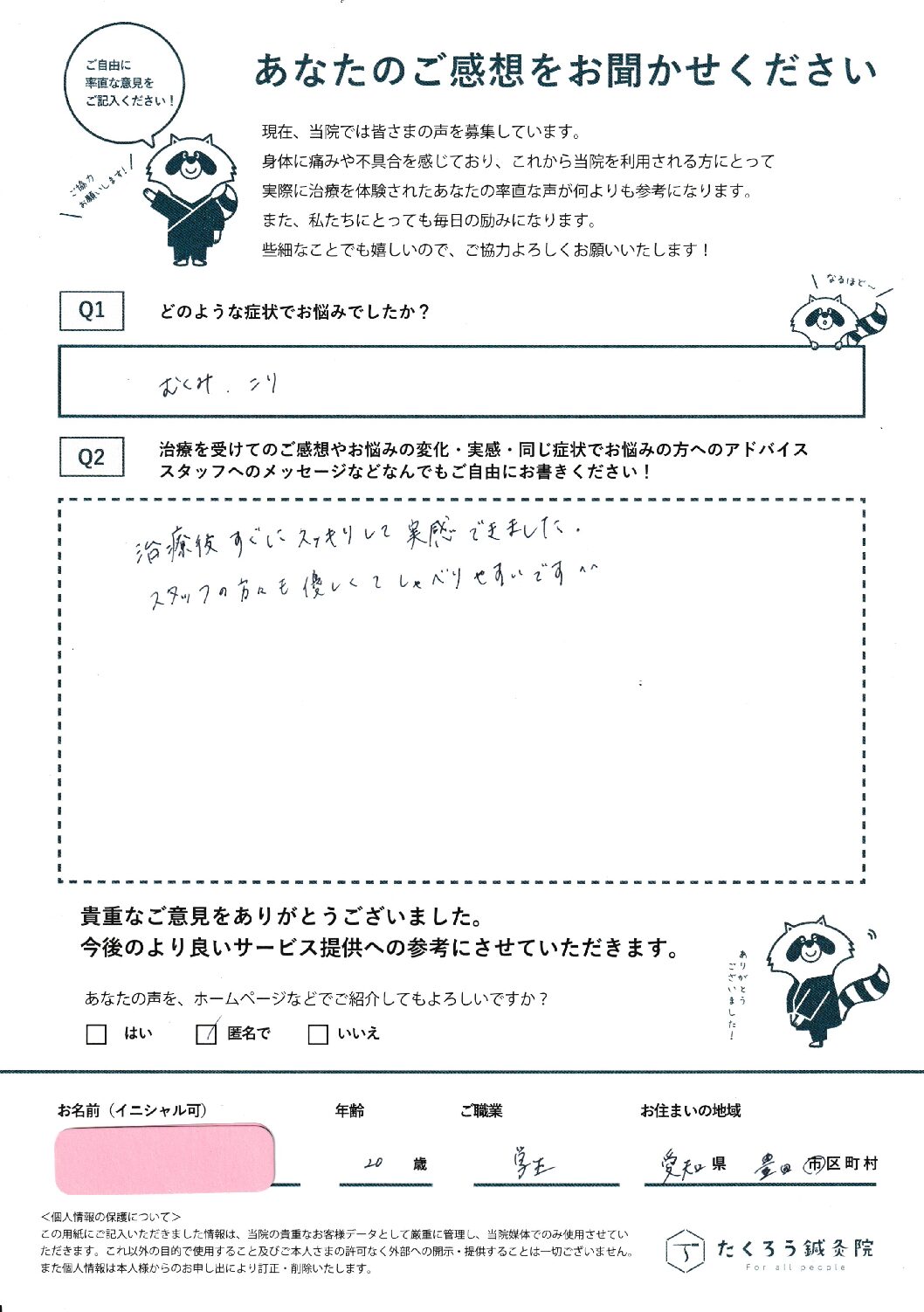 お灸を初めてやってみて、とても不思議な感じでとてもいい体験でした。先生が優しくて、会話が楽しかったです。