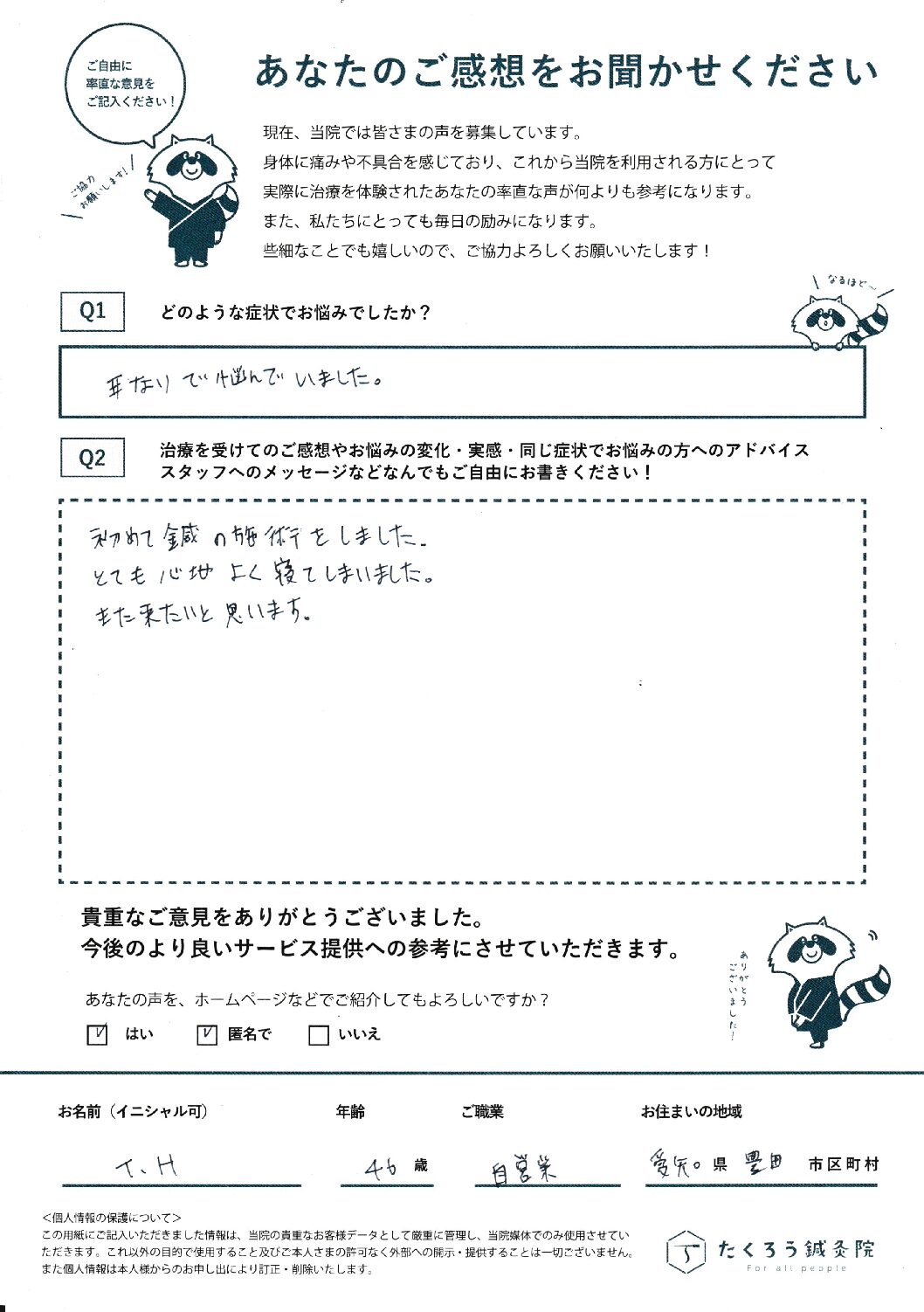 たくろう鍼灸院で施術をさせていただいたお客様のご感想を掲載しています。