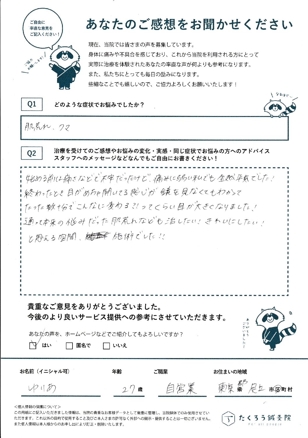【肌荒れ・むくみ】長年、肌荒れやむくみが気になっていたのでたくろう鍼灸院にてお世話になりました。特にむくみについては、治療後すぐに効果があり、とてもスッキリした印象になりま…