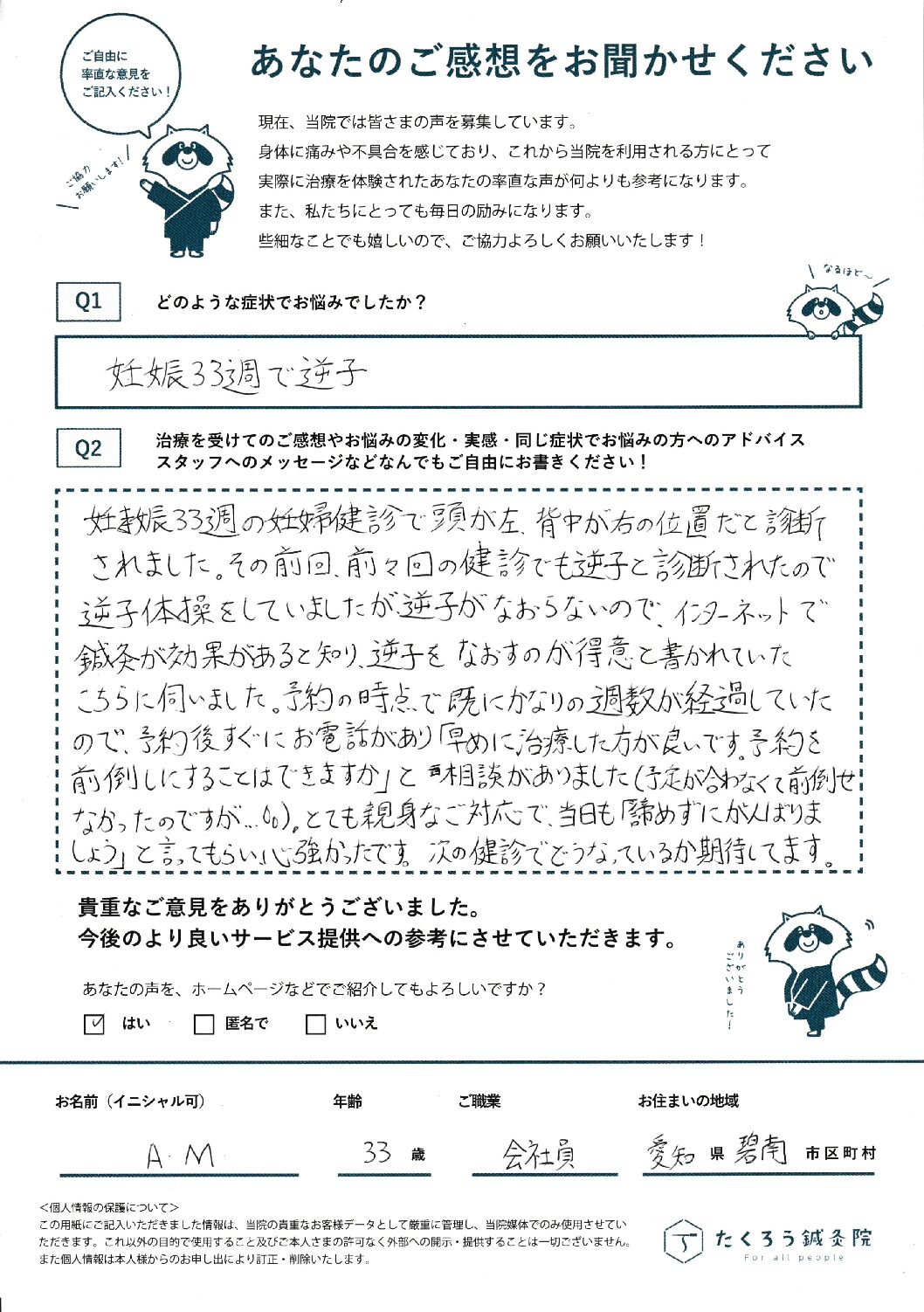 妊娠33週の分婦検診で頭が左、背中が右の位置だと診断されました。その前回、前々回の健診でも逆子と診断されたので逆子体操をしていましたが、逆子が治らないので、インターネットで鍼灸…