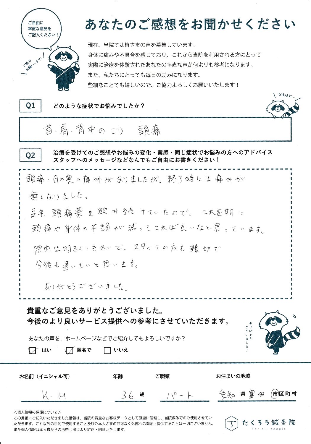 頭痛、目の奥の痛みがありましたが終了時には痛みがなくなりました。長年、頭痛薬を飲み頭痛や頭痛や身体の不調が減ってこれば良いなと思っています。院内は明るくキレイでスタッフの方…