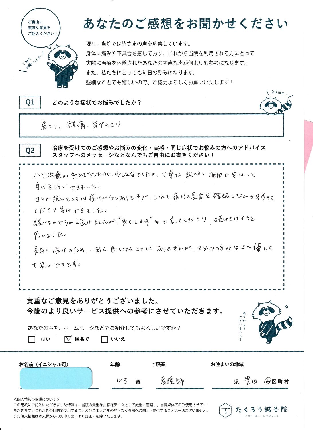 たくろう鍼灸院で施術をさせていただいたお客様のご感想を掲載しています。