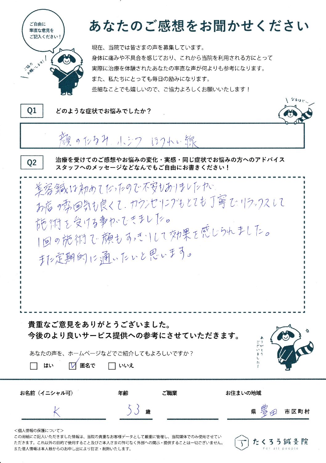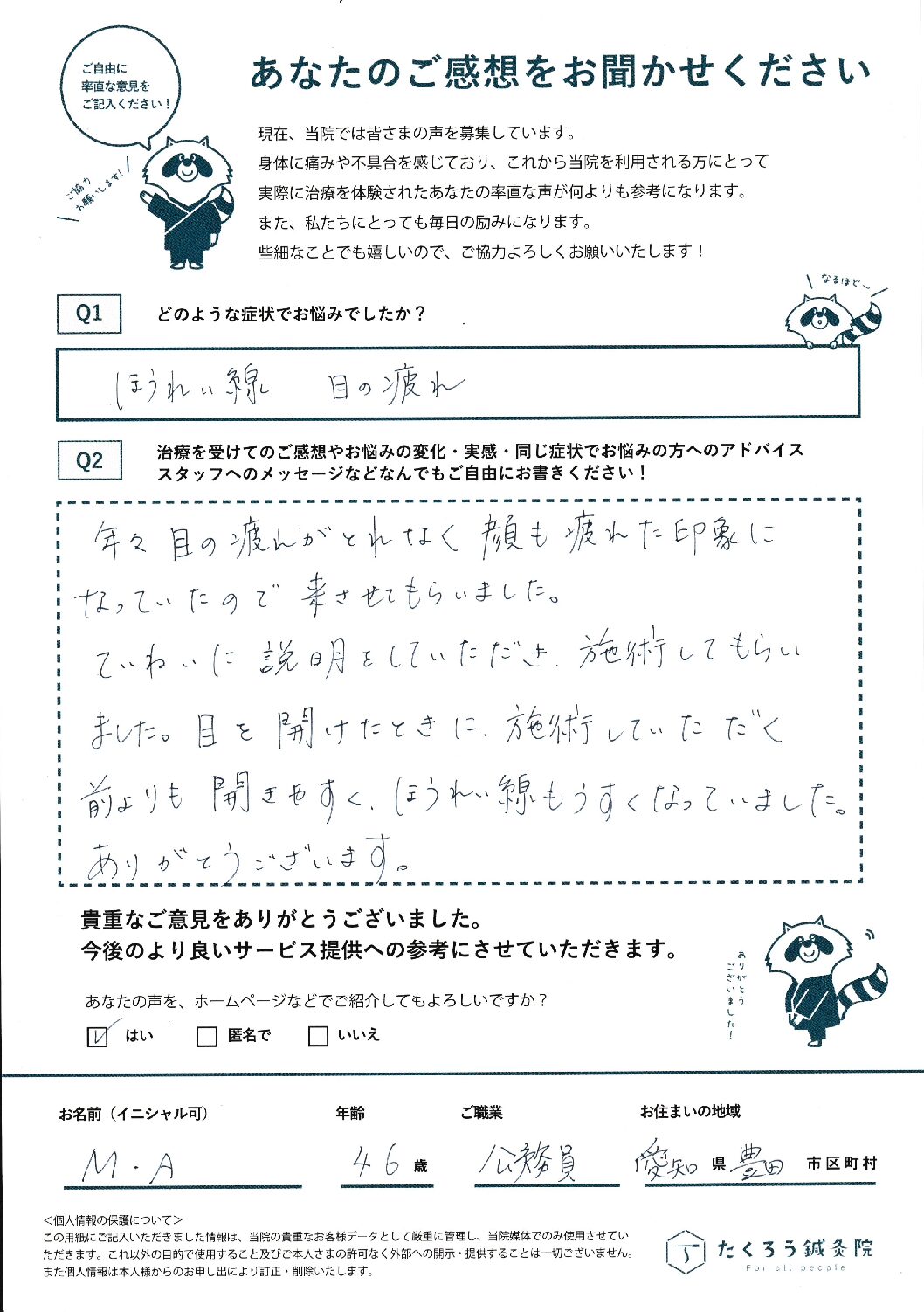 年々目の疲れがとれなく、顔も疲れた印象になっていたので来させてもらいました。丁寧に説明をしていただき施術してもらいました。目を開けたときに施術していただく前よりも開きやす…