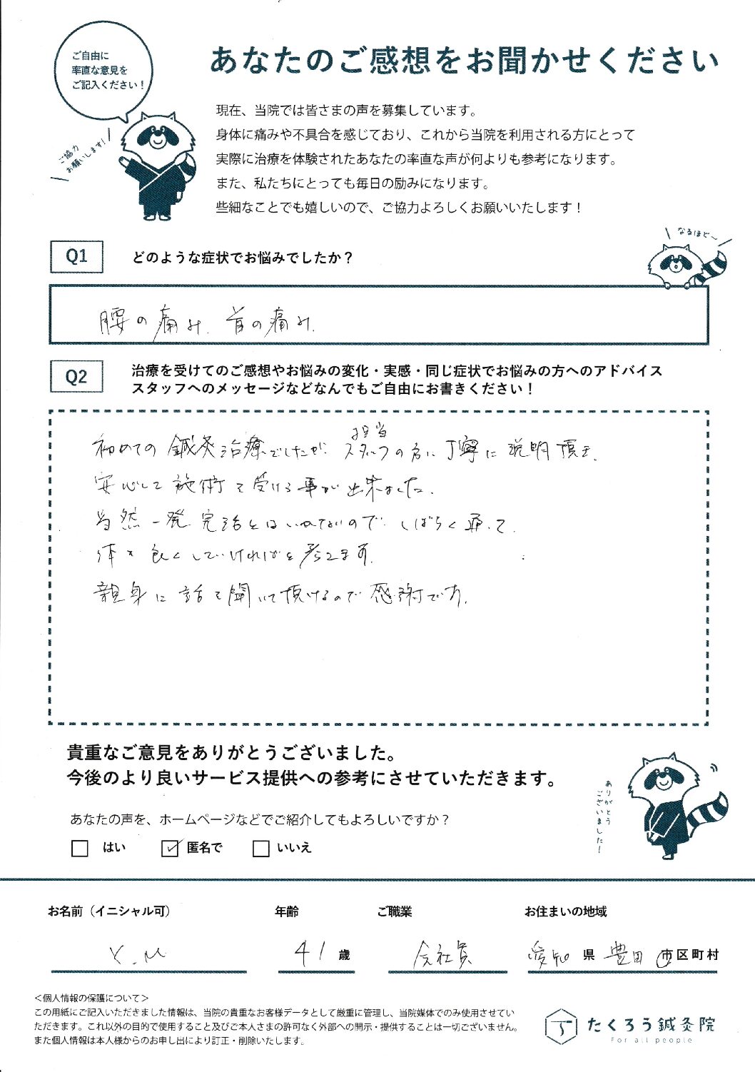 たくろう鍼灸院で施術をさせていただいたお客様のご感想を掲載しています。