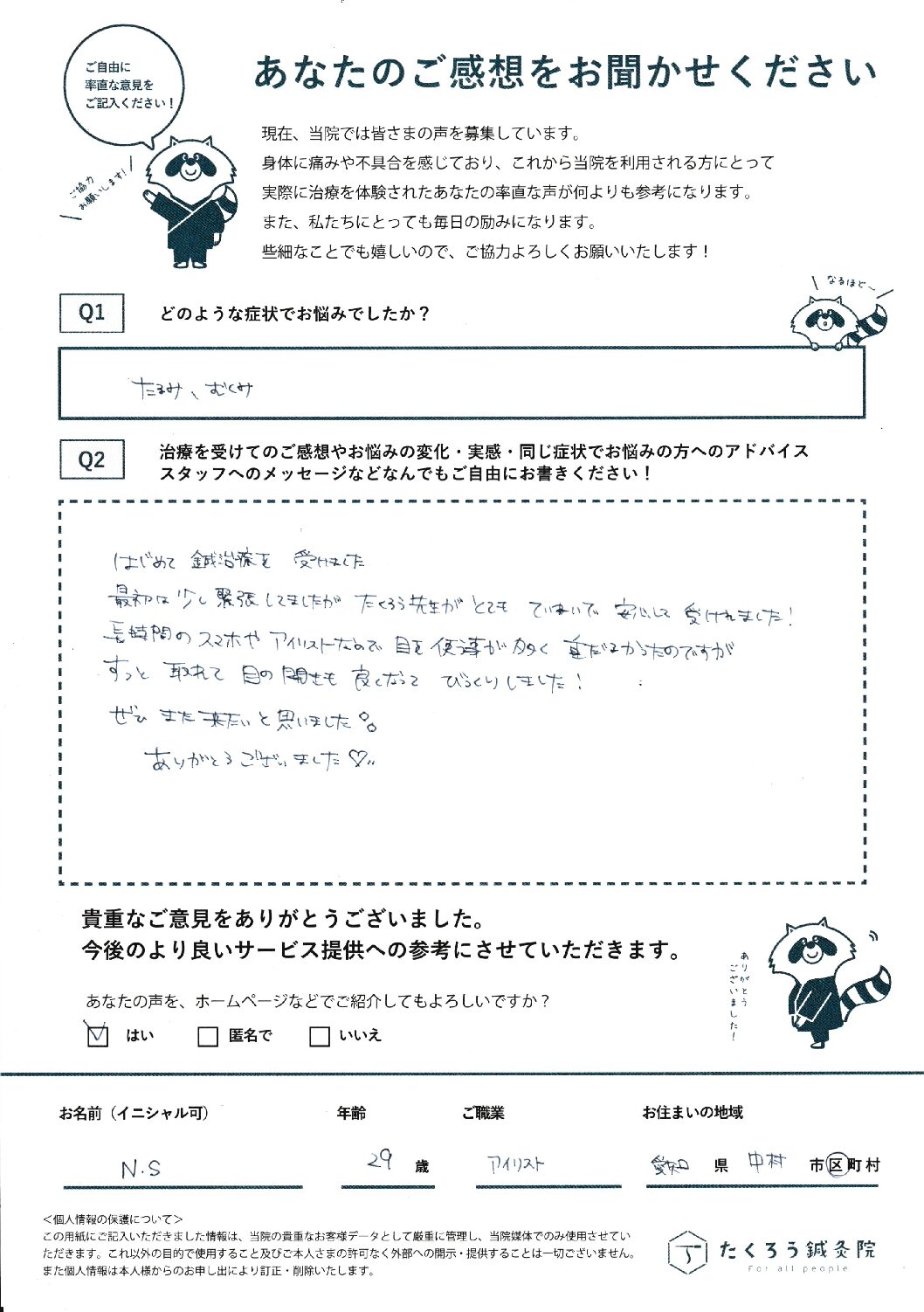 施術を受けてのご感想やお悩みの変化・実感・同じ症状でお悩みの方へのアドバイスやスタッフへのメッセージなどなんでもご自由にお書きください!