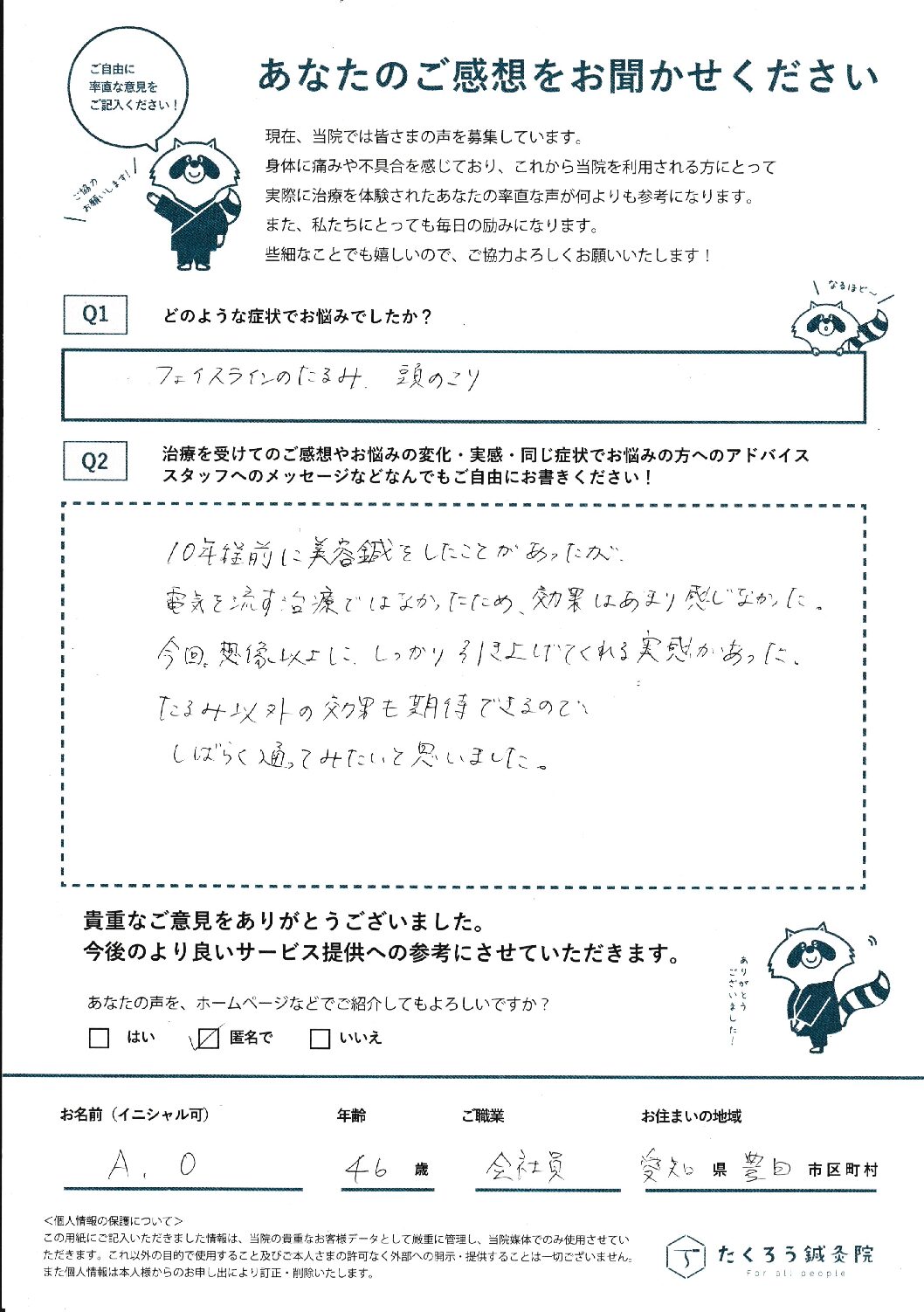 たくろう鍼灸院で施術をさせていただいたお客様のご感想を掲載しています。