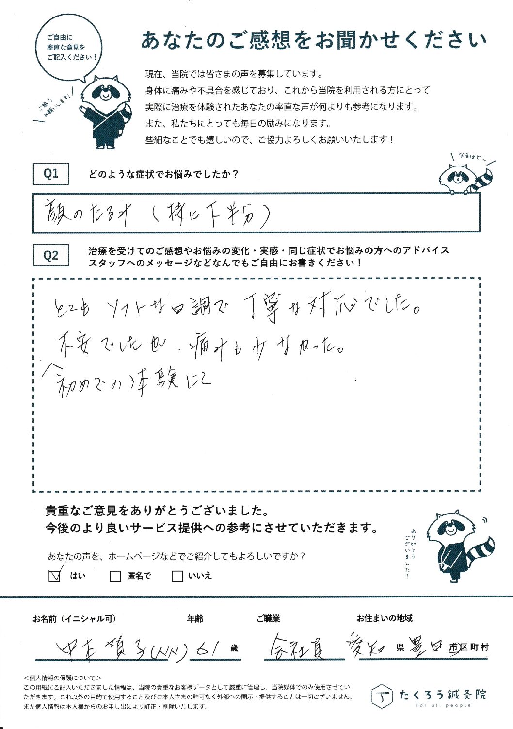 たくろう鍼灸院で施術をさせていただいたお客様のご感想を掲載しています。