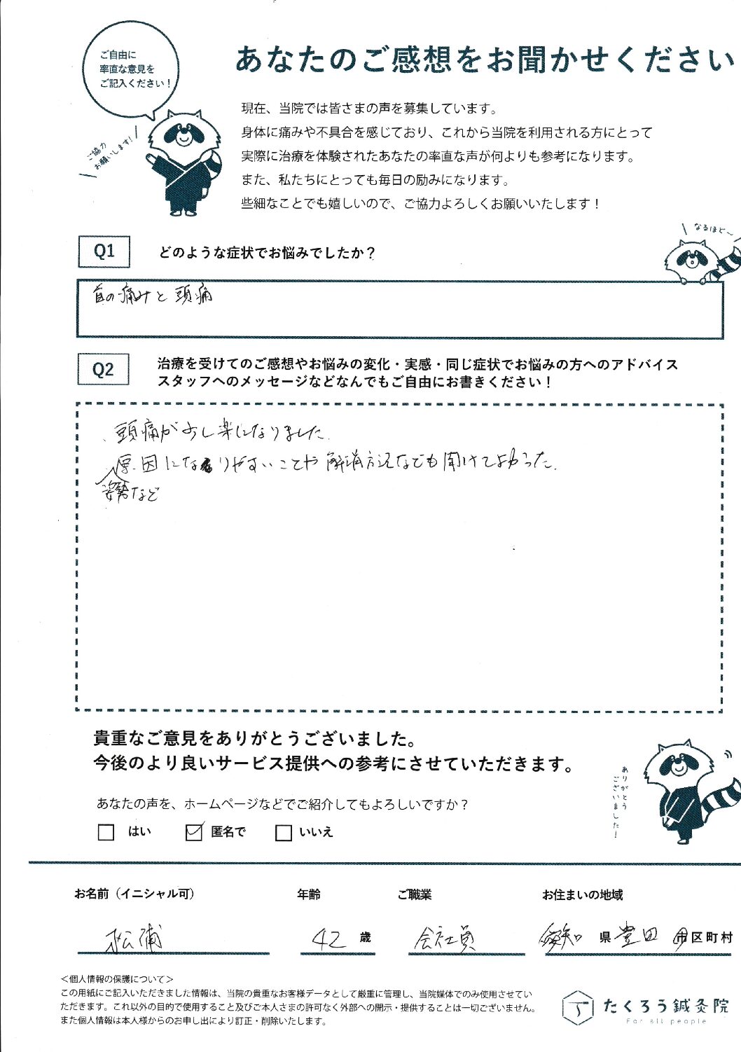 たくろう鍼灸院で施術をさせていただいたお客様のご感想を掲載しています。